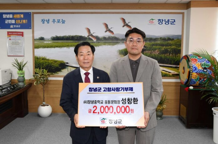 [경상뉴스=이계원 선임기자]경남 창녕군 향우들의 고향사랑기부 행렬이 이어지고 있는 가운데 성창환 전 창녕중학교 총동문회 회장과 그의 장남 성석훈 씨가 창녕군에 고향사랑기부금을 각 100만 원씩 총 200만 원을 기탁했다.