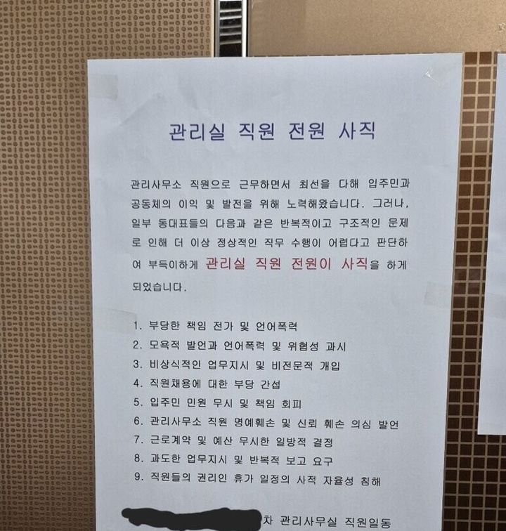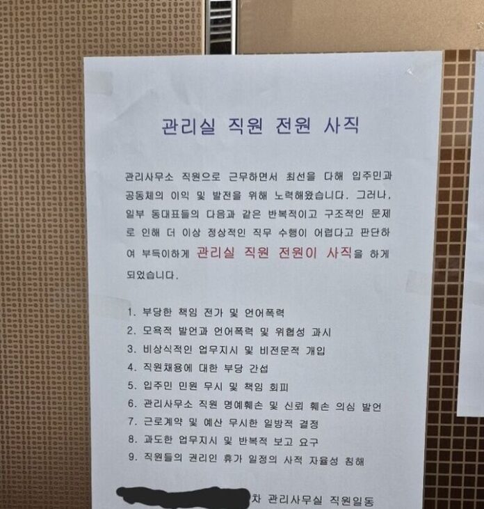 해당 안내문에는 ‘관리실 직원 전원 사직’이라는 제목과 함께 “관리사무소 직원으로 근무하면서 최선을 다해 입주민과 공동체의 이익 및 발전을 위해 노력해왔습니다. 그러나 일부 동대표들의 다음과 같은 반복적이고 구조적인 문제로 인해 더는 정상적인 직무 수행이 어렵다고 판단해 부득이하게 관리실 직원 전원이 사직을 하게 됐습니다”라고 적혔다.