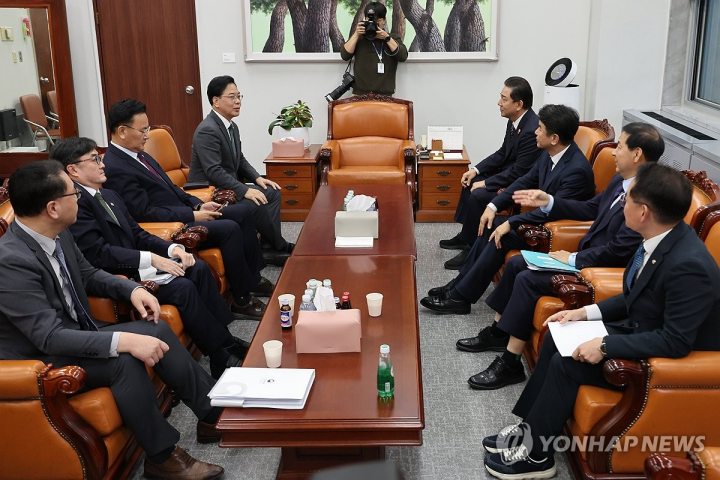 더불어민주당 김병기 원내대표와 문진석 원내운영수석대표, 국민의힘 송언석 원내대표와 유상범 원내운영수석부대표가 1일 서울 여의도 국회에서 구윤철 부총리 겸 기획재정부 장관이 참석한 가운데 쟁점 예산과 법인세·교육세 인상안을 두고 막판 협상을 하기 위해 회동하고 있다. 2025.12.1
