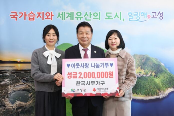 [경상뉴스=김용수 대기자]경남 고성군 대독리 소재 한국사무가구 김현주 부사장은 1월 6일, 고성군청을 방문하여 관내 어려운 이웃을 위해 써 달라며 이웃돕기성금 200만 원을 전달했다.