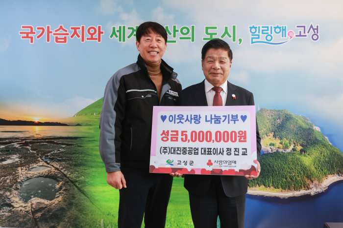 [경상뉴스=김용수 대기자]㈜대진중공업(대표이사 정진교)은 9일 고성군청을 방문하여 어려운 이웃을 위한 성금 500만 원을 전달했다.