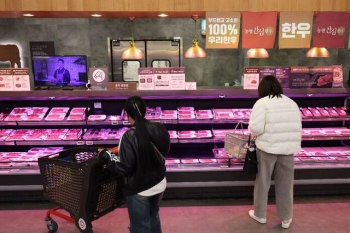 ▲한 시민이 16일 서울 시내 한 대형마트 육류 코너를 둘러보고 있다. 이날 축산물품질평가원 축산물유통정보에 따르면 지난주 삼겹살은 100g당 2629원으로 1년 전 같은 기간보다 6.2% 올랐다. 연합뉴스