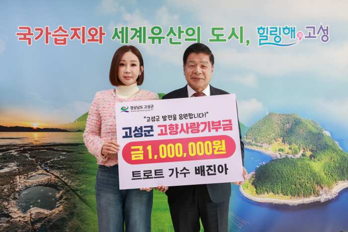 [경상뉴스=김용수 대기자]경남 고성군(군수 이상근)은 트로트 가수 배진아가 고향 고성을 응원하는 마음에 진심을 담아 고향사랑기부금 100만 원을 기부했다고 밝혔다.