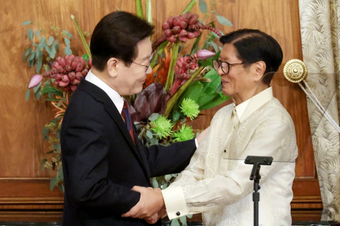 ▲ 필리핀을 국빈 방문 중인 이재명 대통령이 3일(현지 시간) 마닐라 말라카냥궁에서 페르디난드 마르코스 주니어 대통령과 한-필리핀 공동 언론발표를 마친 뒤 인사하고 있다. 2026.03.03.