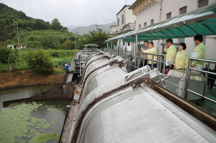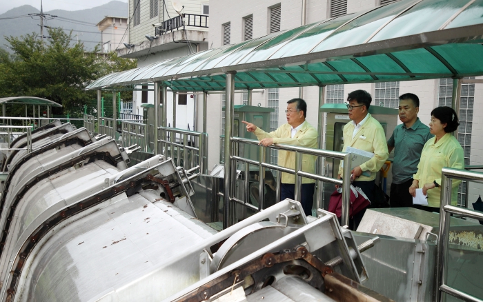 ▲박일호 밀양시장이 9일 제6호 태풍 ‘카눈’ 대비 삼랑진 검세배수장을 점검하고 있다.