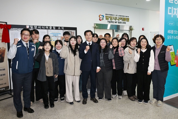 ▲2일 밀양시가 밀양시니어클럽을 방문해 현장을 점검하고 기념 촬영을 하고 있다.