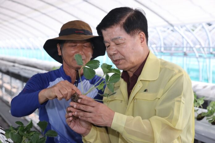 [경상뉴스=김용수 대기자]이상근 고성군수는 지난 7일, 삼산면 딸기 재배농가(이선갑, 공룡나라딸기연합회장)의 딸기 우량모 정식 현장을 방문하고 농가의 어려운 점을 청취하는 등 고품질 딸기 생산을 위해 지원방안을 모색하는 시간을 가졌다.