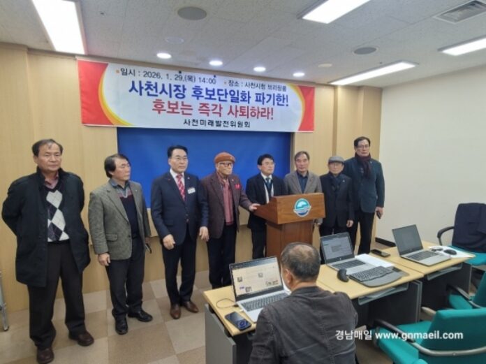 사천미래발전위원회는 29일 사천시청 브리핑룸에서 기자회견을 열고 “사천시민의 뜻을 모아 단일화를 추진해 왔으나, 정대웅 후보가 합의 후 일방적으로 이탈하며 단일화 약속을 스스로 파기했다”고 주장했다. 위원회는 지난해 11월 발족 이후 후보자 간 협의를 통해 3자 합의를 이끌어냈으며, 단일화 추진 과정 전반을 공식 기구로서 주관해 왔다고 설명했다.