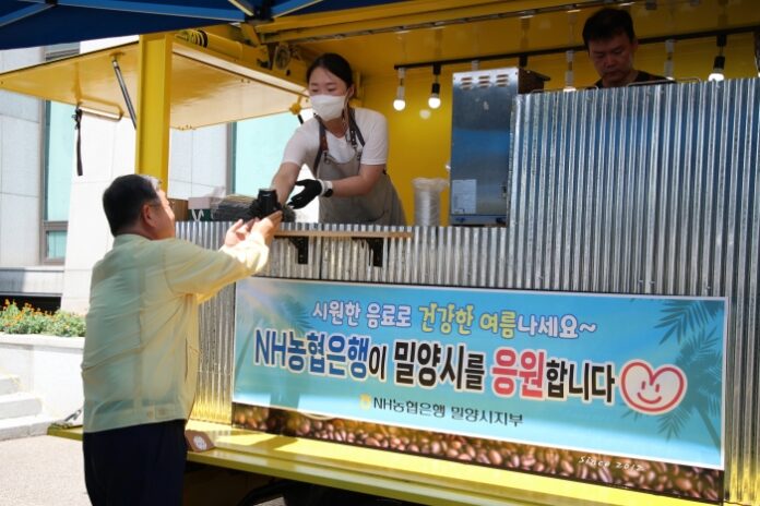 [경상뉴스=이계원 선임기자]NH농협은행 밀양시지부(지부장 이상훈)는 21일 밀양시청 광장에서 시민과 공무원을 응원하기 위해 ‘커피차’ 이벤트를 진행했다.